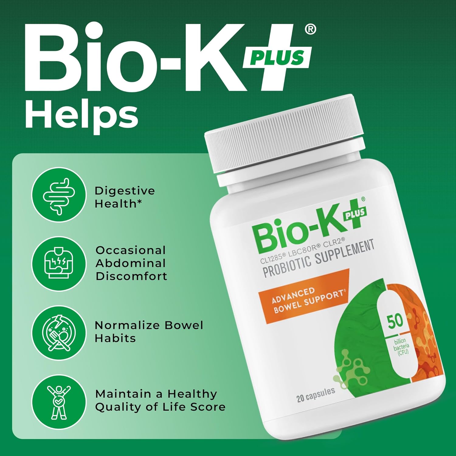 Bio K+ دعم الأمعاء المتقدم – بروبيوتيك نباتي لصحة الجهاز الهضمي، للنساء والرجال، يساعد على إعادة عادات الأمعاء والانزعاج العرضي، خالي من الغلوتين، غير معدل وراثيًا، 50 مليار CFU – 20 كبسولة