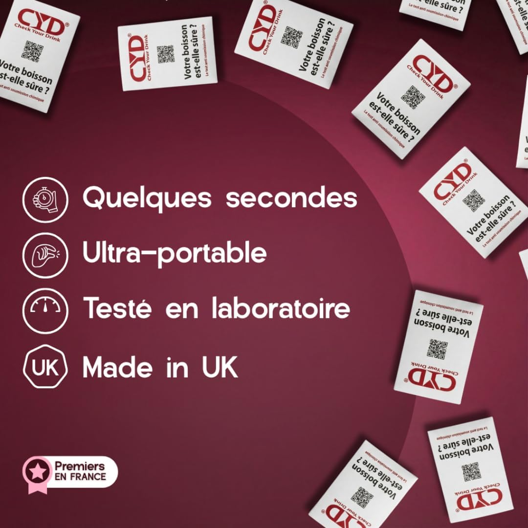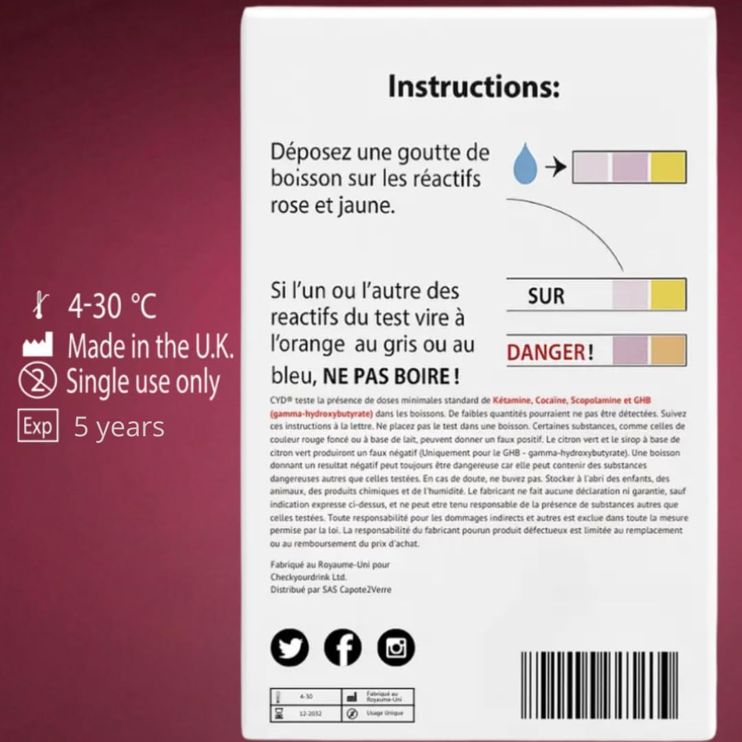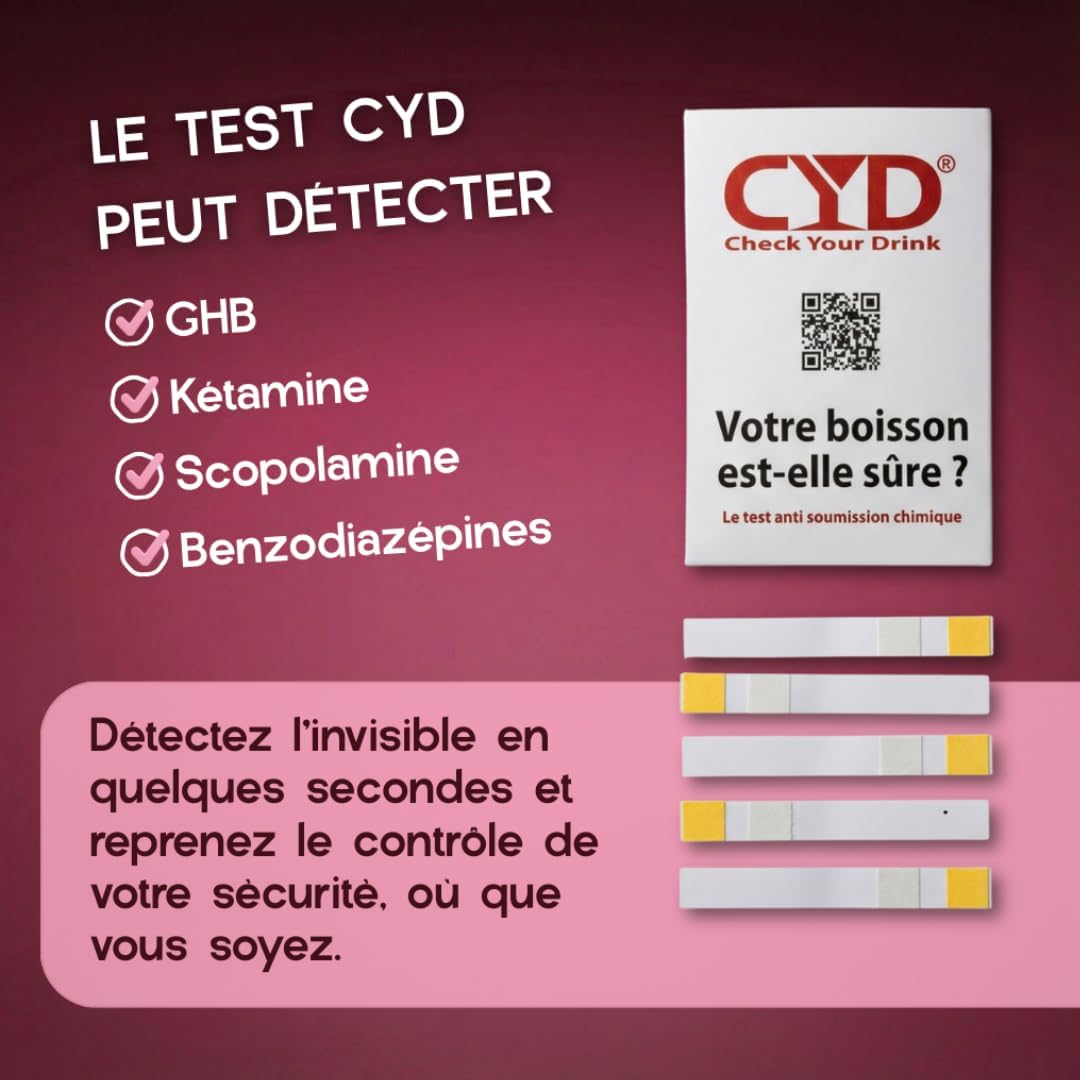 اختبار Drogue CYD هو مجموعة أدوات للتنقيب السريع والعملي للكشف عن المخدرات في مشروباتك. تتضمن هذه المجموعة 5 اختبارات فردية، مما يسمح لك بالتحقق من وجود مواد غير مرغوبة في مشروباتك خلال دقيقتين فقط. بفضل تصميمها المدمج، يمكنك حملها بسهولة في جيبك أو حقيبتك. هذا الاختبار مناسب للاستخدام في المناسبات الاجتماعية لضمان سلامتك.